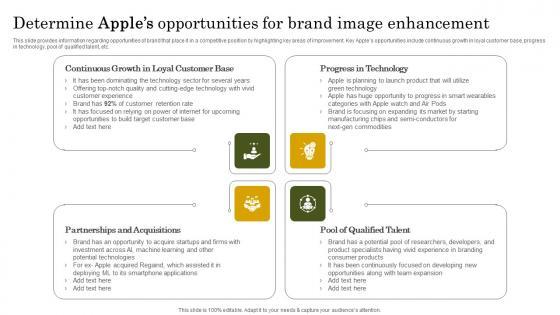 This slide provides information regarding opportunities of brand that place it in a competitive position by highlighting key areas of improvement. Key Apples opportunities include continuous growth in loyal customer base, progress in technology, pool of qualified talent, etc. Coming up with a presentation necessitates that the majority of the effort goes into the content and the message you intend to convey. The visuals of a PowerPoint presentation can only be effective if it supplements and supports the story that is being told. Keeping this in mind our experts created Determine Apples Opportunities Apple Branding Strategy To Become Market Leader Mockup Pdf to reduce the time that goes into designing the presentation. This way, you can concentrate on the message while our designers take care of providing you with the right template for the situation. This slide provides information regarding opportunities of brand that place it in a competitive position by highlighting key areas of improvement. Key Apples opportunities include continuous growth in loyal customer base, progress in technology, pool of qualified talent, etc.