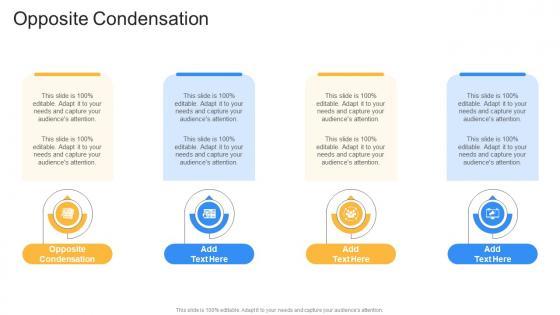 Introducing our well designed Opposite Condensation In Powerpoint And Google Slides Cpb. This PowerPoint design presents information on topics like Opposite Condensation. As it is predesigned it helps boost your confidence level. It also makes you a better presenter because of its high quality content and graphics. This PPT layout can be downloaded and used in different formats like PDF, PNG, and JPG. Not only this, it is available in both Standard Screen and Widescreen aspect ratios for your convenience. Therefore, click on the download button now to persuade and impress your audience. Our Opposite Condensation In Powerpoint And Google Slides Cpb are topically designed to provide an attractive backdrop to any subject. Use them to look like a presentation pro.
