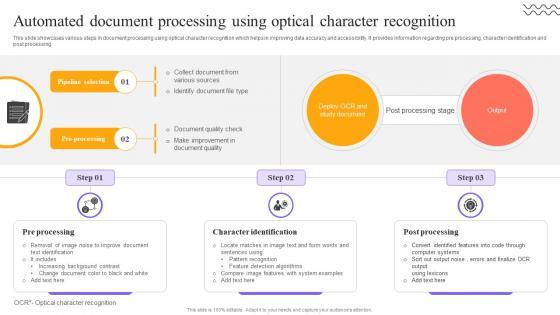This slide showcases various steps in document processing using optical character recognition which helps in improving data accuracy and accessibility. It provides information regarding pre processing, character identification and post processing. Present like a pro with Digital Approach To Client Automated Document Processing Using Optical Character. Create beautiful presentations together with your team, using our easy-to-use presentation slides. Share your ideas in real-time and make changes on the fly by downloading our templates. So whether you are in the office, on the go, or in a remote location, you can stay in sync with your team and present your ideas with confidence. With Slidegeeks presentation got a whole lot easier. Grab these presentations today. This slide showcases various steps in document processing using optical character recognition which helps in improving data accuracy and accessibility. It provides information regarding pre processing, character identification and post processing.