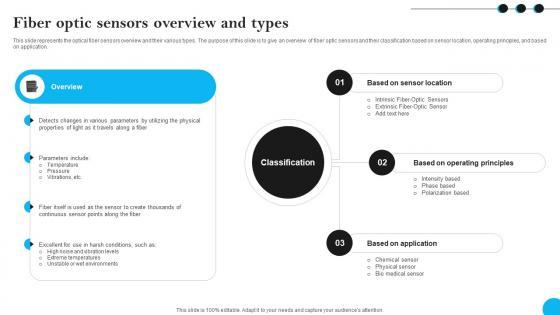 This slide represents the optical fiber sensors overview and their various types. The purpose of this slide is to give an overview of fiber optic sensors and their classification based on sensor location, operating principles, and based on application. Create an editable Fiber Optic Sensors Overview And Types Fibers IT that communicates your idea and engages your audience. Whether you are presenting a business or an educational presentation, pre-designed presentation templates help save time. Fiber Optic Sensors Overview And Types Fibers IT is highly customizable and very easy to edit, covering many different styles from creative to business presentations. Slidegeeks has creative team members who have crafted amazing templates. So, go and get them without any delay. This slide represents the optical fiber sensors overview and their various types. The purpose of this slide is to give an overview of fiber optic sensors and their classification based on sensor location, operating principles, and based on application.