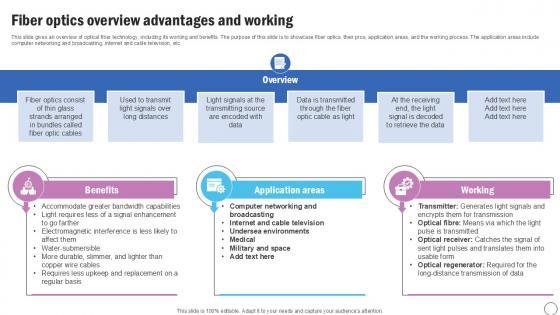 This slide gives an overview of optical fiber technology, including its working and benefits. The purpose of this slide is to showcase fiber optics, their pros, application areas, and the working process. The application areas include computer networking and broadcasting, internet and cable television, etc. Want to ace your presentation in front of a live audience Our Fiber Optics Overview Advantages And Working Fibers IT can help you do that by engaging all the users towards you. Slidegeeks experts have put their efforts and expertise into creating these impeccable powerpoint presentations so that you can communicate your ideas clearly. Moreover, all the templates are customizable, and easy-to-edit and downloadable. Use these for both personal and commercial use. This slide gives an overview of optical fiber technology, including its working and benefits. The purpose of this slide is to showcase fiber optics, their pros, application areas, and the working process. The application areas include computer networking and broadcasting, internet and cable television, etc.