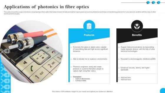 This slide shows the usage of photonics engineering in fibre optics that helps to transmit data and light at rapid speed across long distances and helps in transferring pictures from one device to another with the help of other electrical technologies. From laying roadmaps to briefing everything in detail, our templates are perfect for you. You can set the stage with your presentation slides. All you have to do is download these easy-to-edit and customizable templates. Fibers IT Applications Of Photonics In Fibre Optics will help you deliver an outstanding performance that everyone would remember and praise you for. Do download this presentation today. This slide shows the usage of photonics engineering in fibre optics that helps to transmit data and light at rapid speed across long distances and helps in transferring pictures from one device to another with the help of other electrical technologies.