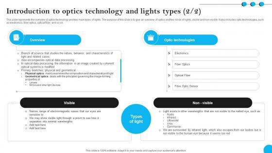 This slide represents the overview of optics technology and two main types of lights. The purpose of this slide is to give an overview of optics and two kinds of lights, visible and non-visible. It also includes optic technologies, such as electronics, fiber optics, optical fiber, and so on. This modern and well-arranged Fibers IT Introduction To Optics Technology And Lights Types provides lots of creative possibilities. It is very simple to customize and edit with the Powerpoint Software. Just drag and drop your pictures into the shapes. All facets of this template can be edited with Powerpoint, no extra software is necessary. Add your own material, put your images in the places assigned for them, adjust the colors, and then you can show your slides to the world, with an animated slide included. This slide represents the overview of optics technology and two main types of lights. The purpose of this slide is to give an overview of optics and two kinds of lights, visible and non-visible. It also includes optic technologies, such as electronics, fiber optics, optical fiber, and so on.