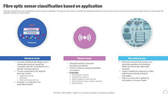 This slide represents the types of optical fiber sensors based on application. The purpose of this slide is to highlight the application-based fiber optics sensors such as chemical, physical and bio-medical sensors. It also includes the application domains for these sensors. Welcome to our selection of the Fibre Optic Sensor Classification Based On Application Fibers IT. These are designed to help you showcase your creativity and bring your sphere to life. Planning and Innovation are essential for any business that is just starting out. This collection contains the designs that you need for your everyday presentations. All of our PowerPoints are 100Percent editable, so you can customize them to suit your needs. This multi-purpose template can be used in various situations. Grab these presentation templates today. This slide represents the types of optical fiber sensors based on application. The purpose of this slide is to highlight the application-based fiber optics sensors such as chemical, physical and bio-medical sensors. It also includes the application domains for these sensors.