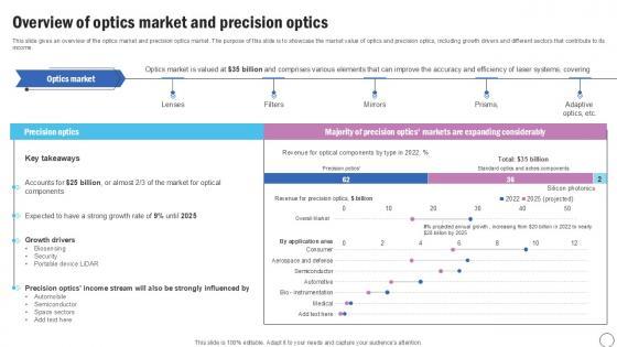 This slide gives an overview of the optics market and precision optics market. The purpose of this slide is to showcase the market value of optics and precision optics, including growth drivers and different sectors that contribute to its income.Create an editable Overview Of Optics Market Silicon Photonics SiPh It Ppt Slide that communicates your idea and engages your audience. Whether you are presenting a business or an educational presentation, pre-designed presentation templates help save time. Overview Of Optics Market Silicon Photonics SiPh It Ppt Slide is highly customizable and very easy to edit, covering many different styles from creative to business presentations. Slidegeeks has creative team members who have crafted amazing templates. So, go and get them without any delay. This slide gives an overview of the optics market and precision optics market. The purpose of this slide is to showcase the market value of optics and precision optics, including growth drivers and different sectors that contribute to its income.