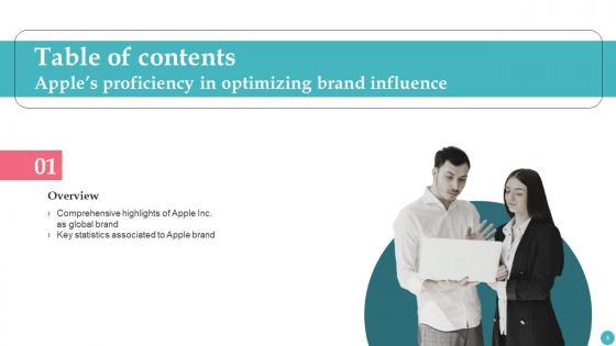 The Apples Proficiency In Optimizing Brand Influence Table Of Contents Diagrams Pdf is a compilation of the most recent design trends as a series of slides. It is suitable for any subject or industry presentation, containing attractive visuals and photo spots for businesses to clearly express their messages. This template contains a variety of slides for the user to input data, such as structures to contrast two elements, bullet points, and slides for written information. Slidegeeks is prepared to create an impression. Our Apples Proficiency In Optimizing Brand Influence Table Of Contents Diagrams Pdf are topically designed to provide an attractive backdrop to any subject. Use them to look like a presentation pro.