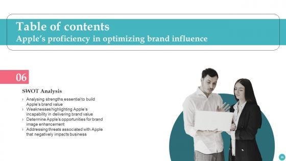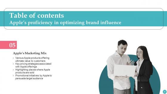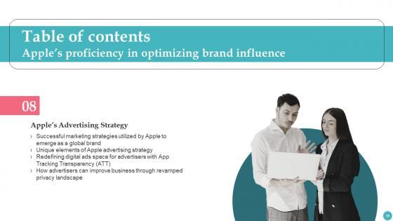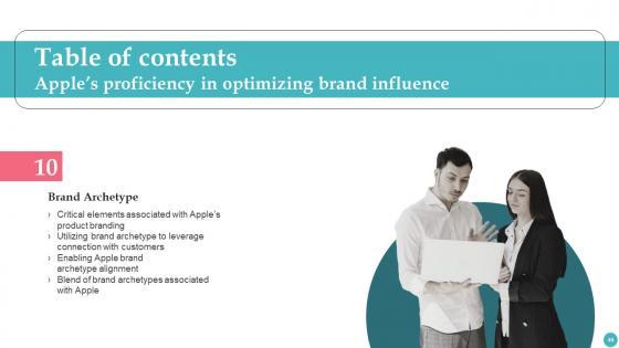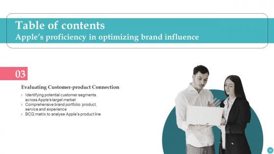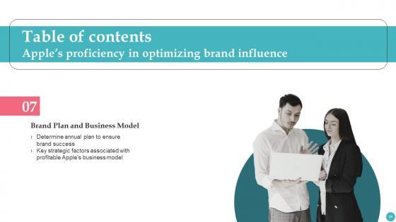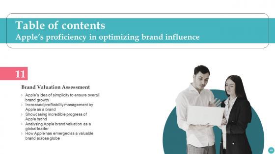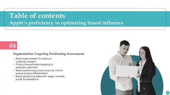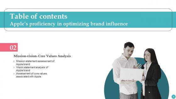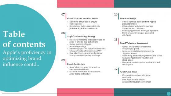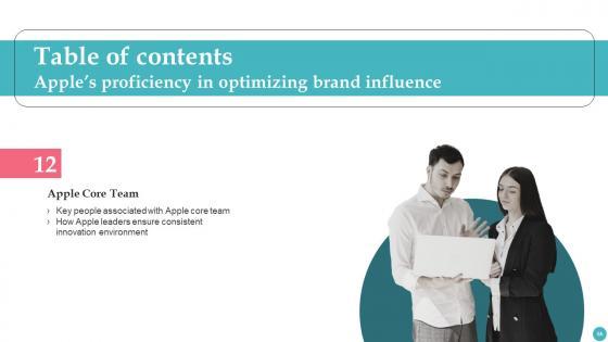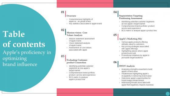 This modern and well-arranged Table Of Contents Apples Proficiency In Optimizing Brand Influence Ideas Pdf provides lots of creative possibilities. It is very simple to customize and edit with the Powerpoint Software. Just drag and drop your pictures into the shapes. All facets of this template can be edited with Powerpoint no extra software is necessary. Add your own material, put your images in the places assigned for them, adjust the colors, and then you can show your slides to the world, with an animated slide included. Our Table Of Contents Apples Proficiency In Optimizing Brand Influence Ideas Pdf are topically designed to provide an attractive backdrop to any subject. Use them to look like a presentation pro.