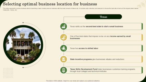 This slide represents a prime business site for launching a lawn mowing service business with the least amount of failure risk. It includes data collection and analysis to choose the best site in terms of the largest client market, manpower, money, etc. Take your projects to the next level with our ultimate collection of Lawn Care Services Business Plan Selecting Optimal Business Location For Business BP SS V. Slidegeeks has designed a range of layouts that are perfect for representing task or activity duration, keeping track of all your deadlines at a glance. Tailor these designs to your exact needs and give them a truly corporate look with your own brand colors they will make your projects stand out from the rest This slide represents a prime business site for launching a lawn mowing service business with the least amount of failure risk. It includes data collection and analysis to choose the best site in terms of the largest client market, manpower, money, etc.