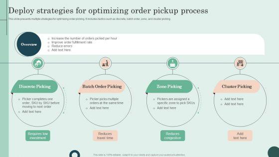 This slide presents multiple strategies for optimizing order picking. It includes tactics such as discrete, batch order, zone, and cluster picking. Formulating a presentation can take up a lot of effort and time, so the content and message should always be the primary focus. The visuals of the PowerPoint can enhance the presenters message, so our Deploy Strategies For Optimizing Order Pickup Process Topics PDF was created to help save time. Instead of worrying about the design, the presenter can concentrate on the message while our designers work on creating the ideal templates for whatever situation is needed. Slidegeeks has experts for everything from amazing designs to valuable content, we have put everything into Deploy Strategies For Optimizing Order Pickup Process Topics PDF.