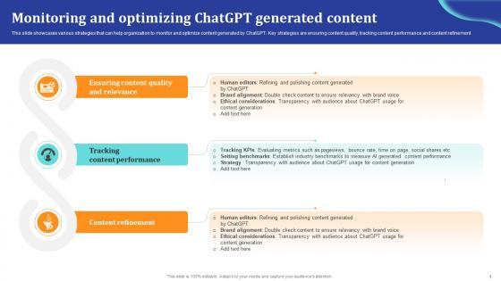 This slide showcases various strategies that can help organization to monitor and optimize content generated by ChatGPT. Key strategies are ensuring content quality, tracking content performance and content refinement. Do you have to make sure that everyone on your team knows about any specific topic I yes, then you should give ChatGpt Comprehensive Guide Monitoring And Optimizing ChatGpt Generated Ppt Slides ChatGpt SS V a try. Our experts have put a lot of knowledge and effort into creating this impeccable ChatGpt Comprehensive Guide Monitoring And Optimizing ChatGpt Generated Ppt Slides ChatGpt SS V. You can use this template for your upcoming presentations, as the slides are perfect to represent even the tiniest detail. You can download these templates from the Slidegeeks website and these are easy to edit. So grab these today This slide showcases various strategies that can help organization to monitor and optimize content generated by ChatGPT. Key strategies are ensuring content quality, tracking content performance and content refinement.