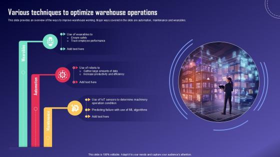 This slide provides an overview of the ways to improve warehouse working. Major ways covered in the slide are automation, maintenance and wearables. Formulating a presentation can take up a lot of effort and time, so the content and message should always be the primary focus. The visuals of the PowerPoint can enhance the presenters message, so our Various Techniques To Optimize IoT Fleet Monitoring Ppt PowerPoint IoT SS V was created to help save time. Instead of worrying about the design, the presenter can concentrate on the message while our designers work on creating the ideal templates for whatever situation is needed. Slidegeeks has experts for everything from amazing designs to valuable content, we have put everything into Various Techniques To Optimize IoT Fleet Monitoring Ppt PowerPoint IoT SS V This slide provides an overview of the ways to improve warehouse working. Major ways covered in the slide are automation, maintenance and wearables.