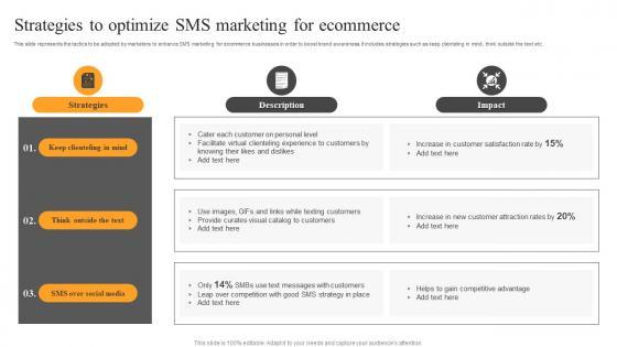 This slide represents the tactics to be adopted by marketers to enhance SMS marketing for ecommerce businesses in order to boost brand awareness. It includes strategies such as keep clienteling in mind, think outside the text etc. Create an editable Strategies To Optimize SMS Marketing Text Message Marketing Strategies Introduction Pdf that communicates your idea and engages your audience. Whether you are presenting a business or an educational presentation, pre-designed presentation templates help save time. Strategies To Optimize SMS Marketing Text Message Marketing Strategies Introduction Pdf is highly customizable and very easy to edit, covering many different styles from creative to business presentations. Slidegeeks has creative team members who have crafted amazing templates. So, go and get them without any delay. This slide represents the tactics to be adopted by marketers to enhance SMS marketing for ecommerce businesses in order to boost brand awareness. It includes strategies such as keep clienteling in mind, think outside the text etc.