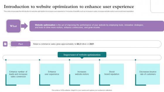 This slide showcases the introduction to website optimization to increase user experience. It includes it benefits such as increase in sales, increase website visitors and boost brand reputation. There are so many reasons you need a Introduction Website Optimization Comprehensive Marketing Guide For Tourism Industry Download Pdf. The first reason is you can not spend time making everything from scratch, Thus, Slidegeeks has made presentation templates for you too. You can easily download these templates from our website easily. This slide showcases the introduction to website optimization to increase user experience. It includes it benefits such as increase in sales, increase website visitors and boost brand reputation.
