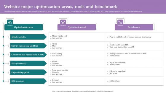 This slide showcases the website important optimization areas, tools and benchmark. It includes optimization areas such as mobile usability, SEO, page loading speed and conversion rate optimization. Explore a selection of the finest Website Major Optimization Comprehensive Marketing Guide For Tourism Industry Topics Pdf here. With a plethora of professionally designed and pre made slide templates, you can quickly and easily find the right one for your upcoming presentation. You can use our Website Major Optimization Comprehensive Marketing Guide For Tourism Industry Topics Pdf to effectively convey your message to a wider audience. Slidegeeks has done a lot of research before preparing these presentation templates. The content can be personalized and the slides are highly editable. Grab templates today from Slidegeeks. This slide showcases the website important optimization areas, tools and benchmark. It includes optimization areas such as mobile usability, SEO, page loading speed and conversion rate optimization.