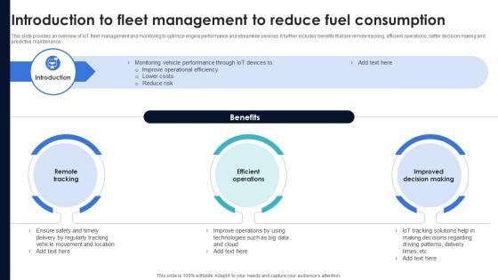 This slide provides an overview of IoT fleet management and monitoring to optimize engine performance and streamline services. It further includes benefits that are remote tracking, efficient operations, better decision making and predictive maintenance. Here you can discover an assortment of the finest PowerPoint and Google Slides templates. With these templates, you can create presentations for a variety of purposes while simultaneously providing your audience with an eye-catching visual experience. Download Optimization Of IoT Remote Monitoring Introduction To Fleet Management To Reduce Fuel IoT SS V to deliver an impeccable presentation. These templates will make your job of preparing presentations much quicker, yet still, maintain a high level of quality. Slidegeeks has experienced researchers who prepare these templates and write high-quality content for you. Later on, you can personalize the content by editing the Optimization Of IoT Remote Monitoring Introduction To Fleet Management To Reduce Fuel IoT SS V. This slide provides an overview of IoT fleet management and monitoring to optimize engine performance and streamline services. It further includes benefits that are remote tracking, efficient operations, better decision making and predictive maintenance.