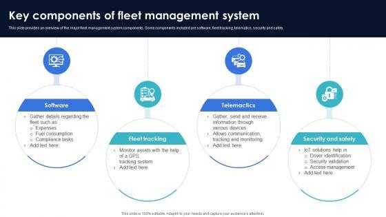 This slide provides an overview of the major fleet management system components. Some components included are software, fleet tracking, telematics, security and safety. From laying roadmaps to briefing everything in detail, our templates are perfect for you. You can set the stage with your presentation slides. All you have to do is download these easy-to-edit and customizable templates. Optimization Of IoT Remote Monitoring Key Components Of Fleet Management System IoT SS V will help you deliver an outstanding performance that everyone would remember and praise you for. Do download this presentation today. This slide provides an overview of the major fleet management system components. Some components included are software, fleet tracking, telematics, security and safety.
