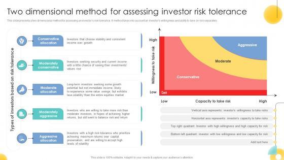 This slide presents a two dimensional method for assessing an investors risk tolerance. It method takes into account an investors willingness and ability to take on risk separately. This modern and well-arranged Two Dimensional Method For Assessing Investor Risk Tolerance Strategic Investment Plan For Optimizing Risk SS V provides lots of creative possibilities. It is very simple to customize and edit with the Powerpoint Software. Just drag and drop your pictures into the shapes. All facets of this template can be edited with Powerpoint, no extra software is necessary. Add your own material, put your images in the places assigned for them, adjust the colors, and then you can show your slides to the world, with an animated slide included. This slide presents a two dimensional method for assessing an investors risk tolerance. It method takes into account an investors willingness and ability to take on risk separately.