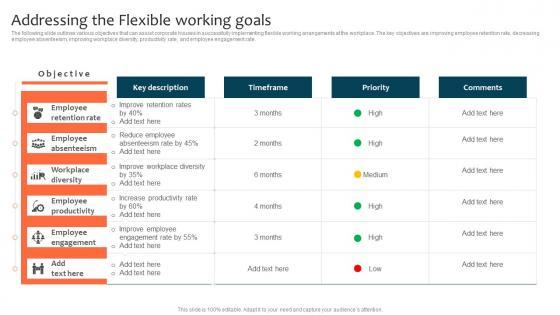 The following slide outlines various objectives that can assist corporate houses in successfully implementing flexible working arrangements at the workplace. The key objectives are improving employee retention rate, decreasing employee absenteeism, improving workplace diversity, productivity rate, and employee engagement rate. Welcome to our selection of the Addressing The Flexible Working Goals Optimizing Staff Retention Rate Guidelines Pdf These are designed to help you showcase your creativity and bring your sphere to life. Planning and Innovation are essential for any business that is just starting out. This collection contains the designs that you need for your everyday presentations. All of our PowerPoints are 100 percent editable, so you can customize them to suit your needs. This multi-purpose template can be used in various situations. Grab these presentation templates today. The following slide outlines various objectives that can assist corporate houses in successfully implementing flexible working arrangements at the workplace. The key objectives are improving employee retention rate, decreasing employee absenteeism, improving workplace diversity, productivity rate, and employee engagement rate.