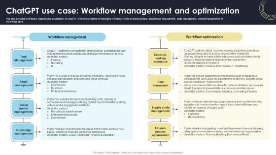 This slide provides information regarding the assimilation of ChatGPT with other systems for managing workflow in terms of tasks handling, social media management, email management, efficient management of knowledge base. There are so many reasons you need a ChatGPT Use Case Workflow Management And Optimization How Generative AI Tools Work AI SS V. The first reason is you can not spend time making everything from scratch, Thus, Slidegeeks has made presentation templates for you too. You can easily download these templates from our website easily. This slide provides information regarding the assimilation of ChatGPT with other systems for managing workflow in terms of tasks handling, social media management, email management, efficient management of knowledge base.