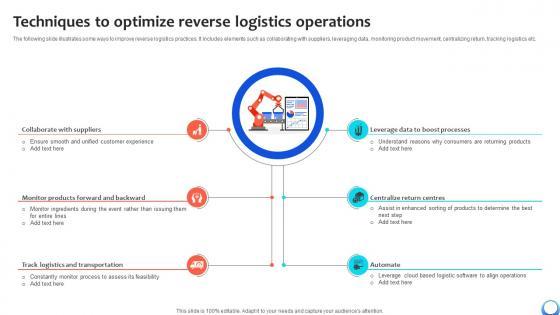 The following slide illustrates some ways to improve reverse logistics practices. It includes elements such as collaborating with suppliers, leveraging data, monitoring product movement, centralizing return, tracking logistics etc. Welcome to our selection of the Techniques To Optimize Reverse Logistics Automating Production Process Strategy SS V. These are designed to help you showcase your creativity and bring your sphere to life. Planning and Innovation are essential for any business that is just starting out. This collection contains the designs that you need for your everyday presentations. All of our PowerPoints are 100Percent editable, so you can customize them to suit your needs. This multi-purpose template can be used in various situations. Grab these presentation templates today. The following slide illustrates some ways to improve reverse logistics practices. It includes elements such as collaborating with suppliers, leveraging data, monitoring product movement, centralizing return, tracking logistics etc.