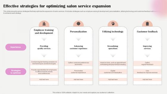 This slide presents various strategies that help optimize the expansion of salon services. It includes strategies such as employee raining and development, personalization, utilizing technology and customer feedback with technique to enhance each strategy. Crafting an eye-catching presentation has never been more straightforward. Let your presentation shine with this tasteful yet straightforward Salon Marketing Plan To Optimize Customized Effective Strategies For Optimizing Strategy SS V template. It offers a minimalistic and classy look that is great for making a statement. The colors have been employed intelligently to add a bit of playfulness while still remaining professional. Construct the ideal Salon Marketing Plan To Optimize Customized Effective Strategies For Optimizing Strategy SS V that effortlessly grabs the attention of your audience Begin now and be certain to wow your customers This slide presents various strategies that help optimize the expansion of salon services. It includes strategies such as employee raining and development, personalization, utilizing technology and customer feedback with technique to enhance each strategy.