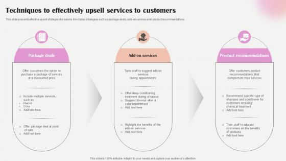 This slide presents effective upsell strategies for salons. It includes strategies such as package deals, add-on services and product recommendations. Slidegeeks has constructed Salon Marketing Plan To Optimize Techniques To Effectively Upsell Services Strategy SS V after conducting extensive research and examination. These presentation templates are constantly being generated and modified based on user preferences and critiques from editors. Here, you will find the most attractive templates for a range of purposes while taking into account ratings and remarks from users regarding the content. This is an excellent jumping-off point to explore our content and will give new users an insight into our top-notch PowerPoint Templates. This slide presents effective upsell strategies for salons. It includes strategies such as package deals, add-on services and product recommendations.