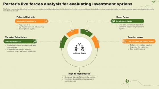 The Porter framework and its effects on the lawn care sector are highlighted on the slide. It includes the threat of new competitors and substitutes, rivalry among rivals, and the negotiating power of suppliers and customers are the main themes covered. Are you searching for a Lawn Care Services Business Plan Porters Five Forces Analysis For Evaluating Investment Options BP SS V that is uncluttered, straightforward, and original Its easy to edit, and you can change the colors to suit your personal or business branding. For a presentation that expresses how much effort you have put in, this template is ideal With all of its features, including tables, diagrams, statistics, and lists, its perfect for a business plan presentation. Make your ideas more appealing with these professional slides. Download Lawn Care Services Business Plan Porters Five Forces Analysis For Evaluating Investment Options BP SS V from Slidegeeks today. The Porter framework and its effects on the lawn care sector are highlighted on the slide. It includes the threat of new competitors and substitutes, rivalry among rivals, and the negotiating power of suppliers and customers are the main themes covered.