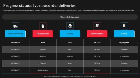 This template shows the various delivery status of the company. The purpose of this slide is to deliver the product on time to the buyer. It includes parameters such as expected date, shipper name, carrier, order number, status.Showcasing this set of slides titled Progress Status Of Various Order Deliveries Download Pdf The topics addressed in these templates are Progress Status, Various Order Deliveries All the content presented in this PPT design is completely editable. Download it and make adjustments in color, background, font etc. as per your unique business setting. This template shows the various delivery status of the company. The purpose of this slide is to deliver the product on time to the buyer. It includes parameters such as expected date, shipper name, carrier, order number, status.