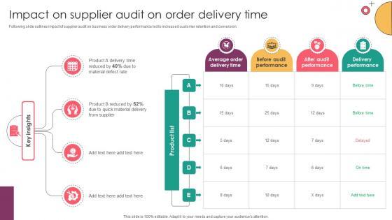 Following slide outlines impact of supplier audit on business order delivery performance led to increased customer retention and conversion. Crafting an eye-catching presentation has never been more straightforward. Let your presentation shine with this tasteful yet straightforward Strategic Supplier Evaluation Impact On Supplier Audit On Order Delivery Time template. It offers a minimalistic and classy look that is great for making a statement. The colors have been employed intelligently to add a bit of playfulness while still remaining professional. Construct the ideal Strategic Supplier Evaluation Impact On Supplier Audit On Order Delivery Time that effortlessly grabs the attention of your audience Begin now and be certain to wow your customers Following slide outlines impact of supplier audit on business order delivery performance led to increased customer retention and conversion.