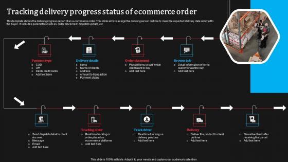 This template shows the delivery progress report of an e commerce order. This slide aims to assign the delivery person on time to meet the expected delivery date referred to the buyer. It includes parameters such as, order placement, dispatch update, etc.Pitch your topic with ease and precision using this Tracking Delivery Progress Status Of Ecommerce Order Professional Pdf This layout presents information on Delivery Details, Browse Info, Track Driver It is also available for immediate download and adjustment. So, changes can be made in the color, design, graphics or any other component to create a unique layout. This template shows the delivery progress report of an e commerce order. This slide aims to assign the delivery person on time to meet the expected delivery date referred to the buyer. It includes parameters such as, order placement, dispatch update, etc.