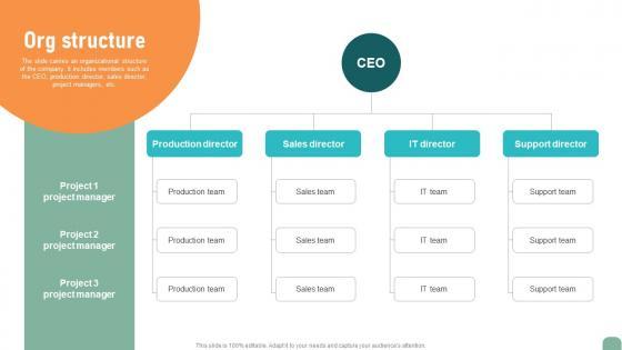 The slide carries an organizational structure of the company. It includes members such as the CEO, production director, sales director, project managers, etc. If you are looking for a format to display your unique thoughts, then the professionally designed Org Structure Circuit Designing Company Investor Fund Raising Pitch Deck Icons Pdf is the one for you. You can use it as a Google Slides template or a PowerPoint template. Incorporate impressive visuals, symbols, images, and other charts. Modify or reorganize the text boxes as you desire. Experiment with shade schemes and font pairings. Alter, share or cooperate with other people on your work. Download Org Structure Circuit Designing Company Investor Fund Raising Pitch Deck Icons Pdf and find out how to give a successful presentation. Present a perfect display to your team and make your presentation unforgettable. The slide carries an organizational structure of the company. It includes members such as the CEO, production director, sales director, project managers, etc.