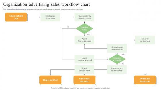 This slide outlines the flowchart for organizational marketing and sales which assist in clear documentation of company. Pitch your topic with ease and precision using this Organization Advertising Sales Workflow Chart Formats Pdf. This layout presents information on Agent Request Approval, Contacting Gents, Agent Reviews Order. It is also available for immediate download and adjustment. So, changes can be made in the color, design, graphics or any other component to create a unique layout. This slide outlines the flowchart for organizational marketing and sales which assist in clear documentation of company.