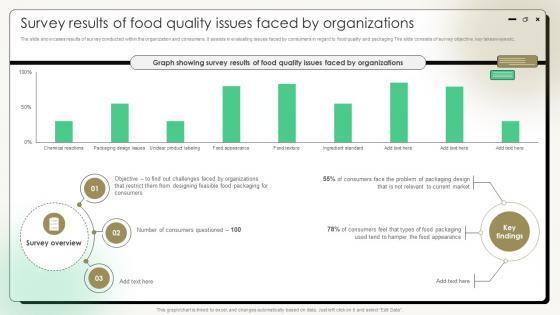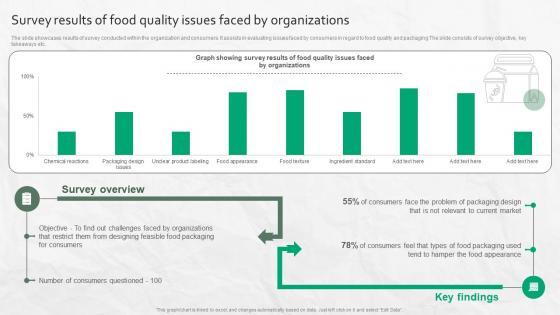 The slide showcases results of survey conducted within the organization and consumers. It assists in evaluating issues faced by consumers in regard to food quality and packaging The slide consists of survey objective, key takeaways etc. Slidegeeks is here to make your presentations a breeze with Survey Results Of Food Quality Issues Faced By Organizations With our easy-to-use and customizable templates, you can focus on delivering your ideas rather than worrying about formatting. With a variety of designs to choose from, you are sure to find one that suits your needs. And with animations and unique photos, illustrations, and fonts, you can make your presentation pop. So whether you are giving a sales pitch or presenting to the board, make sure to check out Slidegeeks first The slide showcases results of survey conducted within the organization and consumers. It assists in evaluating issues faced by consumers in regard to food quality and packaging The slide consists of survey objective, key takeaways etc.