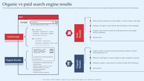 This showcases comparative assessment that can help advertise to differentiate between paid and organic search search. Paid results are quick way to rank on search engine and organic results takes time to rank on result page Take your projects to the next level with our ultimate collection of Organic Vs Paid Search Engine Results Ppt PowerPoint Presentation File Professional PDF. Slidegeeks has designed a range of layouts that are perfect for representing task or activity duration, keeping track of all your deadlines at a glance. Tailor these designs to your exact needs and give them a truly corporate look with your own brand colors they will make your projects stand out from the rest.