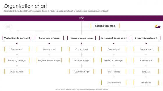 Mentioned slide demonstrates McDonalds organization structure. It includes various departments such as marketing, sales, finance, restaurant, and supply. This Organisation Chart Food And Beverages Company Profile Ppt Template CP SS V from Slidegeeks makes it easy to present information on your topic with precision. It provides customization options, so you can make changes to the colors, design, graphics, or any other component to create a unique layout. It is also available for immediate download, so you can begin using it right away. Slidegeeks has done good research to ensure that you have everything you need to make your presentation stand out. Make a name out there for a brilliant performance. Mentioned slide demonstrates McDonalds organization structure. It includes various departments such as marketing, sales, finance, restaurant, and supply.