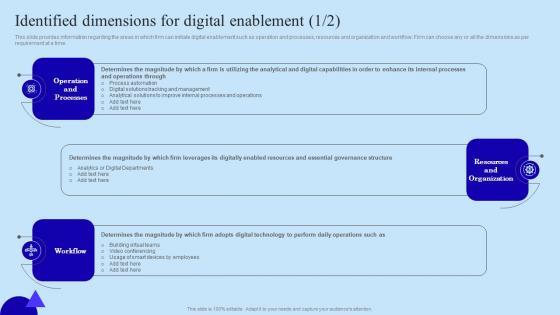 This slide provides information regarding the areas in which firm can initiate digital enablement such as operation and processes, resources and organization and workflow. Firm can choose any or all the dimensions as per requirement at a time. If you are looking for a format to display your unique thoughts, then the professionally designed Identified Dimensions For Digital Enablement Organisational Digital Innovation Structure PDF is the one for you. You can use it as a Google Slides template or a PowerPoint template. Incorporate impressive visuals, symbols, images, and other charts. Modify or reorganize the text boxes as you desire. Experiment with shade schemes and font pairings. Alter, share or cooperate with other people on your work. Download Identified Dimensions For Digital Enablement Organisational Digital Innovation Structure PDF and find out how to give a successful presentation. Present a perfect display to your team and make your presentation unforgettable. This slide provides information regarding the areas in which firm can initiate digital enablement such as operation and processes, resources and organization and workflow. Firm can choose any or all the dimensions as per requirement at a time.