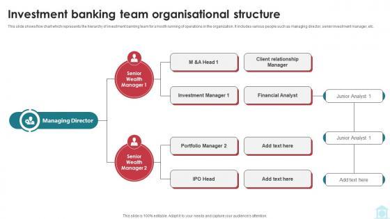 This slide shows flow chart which represents the hierarchy of investment banking team for smooth running of operations in the organization. It includes various people such as managing director, senior investment manager, etc. The Investment Banking Team Organisational Structure Mastering Investment Banking Fin SS V is a compilation of the most recent design trends as a series of slides. It is suitable for any subject or industry presentation, containing attractive visuals and photo spots for businesses to clearly express their messages. This template contains a variety of slides for the user to input data, such as structures to contrast two elements, bullet points, and slides for written information. Slidegeeks is prepared to create an impression. This slide shows flow chart which represents the hierarchy of investment banking team for smooth running of operations in the organization. It includes various people such as managing director, senior investment manager, etc.