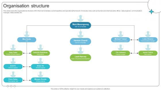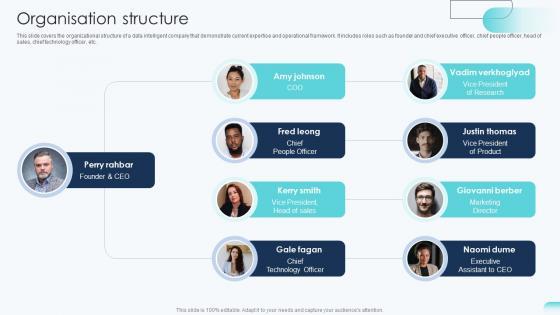 This slide covers the organizational structure of a data intelligent company that demonstrate current expertise and operational framework. It includes roles such as founder and chief executive officer, chief people officer, head of sales, chief technology officer, etc. From laying roadmaps to briefing everything in detail, our templates are perfect for you. You can set the stage with your presentation slides. All you have to do is download these easy-to-edit and customizable templates. Organisation Structure Financial Analytics Platform Investor Elevator Pitch Deck will help you deliver an outstanding performance that everyone would remember and praise you for. Do download this presentation today. This slide covers the organizational structure of a data intelligent company that demonstrate current expertise and operational framework. It includes roles such as founder and chief executive officer, chief people officer, head of sales, chief technology officer, etc.