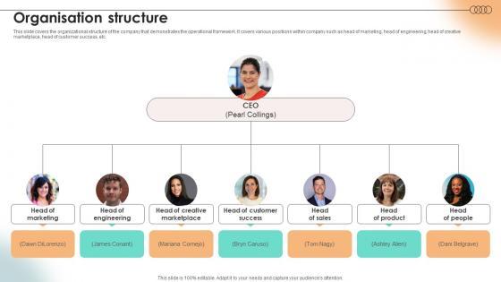 This slide covers the organizational structure of the company that demonstrates the operational framework. It covers various positions within company such as head of marketing, head of engineering, head of creative marketplace, head of customer success, etc. Crafting an eye-catching presentation has never been more straightforward. Let your presentation shine with this tasteful yet straightforward Organisation Structure Content Management Platform Investor Funding Elevator Pitch Deck template. It offers a minimalistic and classy look that is great for making a statement. The colors have been employed intelligently to add a bit of playfulness while still remaining professional. Construct the ideal Organisation Structure Content Management Platform Investor Funding Elevator Pitch Deck that effortlessly grabs the attention of your audience Begin now and be certain to wow your customers This slide covers the organizational structure of the company that demonstrates the operational framework. It covers various positions within company such as head of marketing, head of engineering, head of creative marketplace, head of customer success, etc.