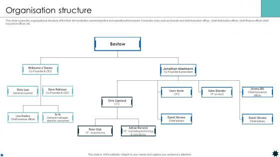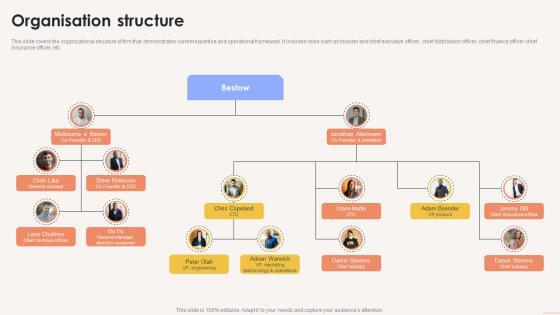 This slide covers the organizational structure of firm that demonstrates current expertise and operational framework. It includes roles such as founder and chief executive officer, chief distribution officer, chief finance officer chief insurance officer, etc. Crafting an eye-catching presentation has never been more straightforward. Let your presentation shine with this tasteful yet straightforward Organisation Structure Term Life Insurance Platform Investor Funding Elevator Pitch Deck template. It offers a minimalistic and classy look that is great for making a statement. The colors have been employed intelligently to add a bit of playfulness while still remaining professional. Construct the ideal Organisation Structure Term Life Insurance Platform Investor Funding Elevator Pitch Deck that effortlessly grabs the attention of your audience Begin now and be certain to wow your customers This slide covers the organizational structure of firm that demonstrates current expertise and operational framework. It includes roles such as founder and chief executive officer, chief distribution officer, chief finance officer chief insurance officer, etc.