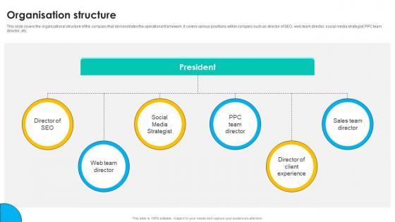 This slide covers the organizational structure of the company that demonstrates the operational framework. It covers various positions within company such as director of SEO, web team director, social media strategist, PPC team director, etc. Crafting an eye-catching presentation has never been more straightforward. Let your presentation shine with this tasteful yet straightforward Organisation Structure Online Marketing Solutions Pitch Deck template. It offers a minimalistic and classy look that is great for making a statement. The colors have been employed intelligently to add a bit of playfulness while still remaining professional. Construct the ideal Organisation Structure Online Marketing Solutions Pitch Deck that effortlessly grabs the attention of your audience Begin now and be certain to wow your customers This slide covers the organizational structure of the company that demonstrates the operational framework. It covers various positions within company such as director of SEO, web team director, social media strategist, PPC team director, etc.