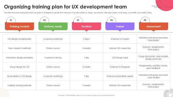 This slide showcases training plan which can guide UX strategists to educate their employees. It provides details UX design, user research, interaction design, visual design, accessibility and usability testing.This modern and well-arranged Organizing Training Plan For User Experience Design Ppt Sample Strategy SS V provides lots of creative possibilities. It is very simple to customize and edit with the Powerpoint Software. Just drag and drop your pictures into the shapes. All facets of this template can be edited with Powerpoint, no extra software is necessary. Add your own material, put your images in the places assigned for them, adjust the colors, and then you can show your slides to the world, with an animated slide included. This slide showcases training plan which can guide UX strategists to educate their employees. It provides details UX design, user research, interaction design, visual design, accessibility and usability testing.