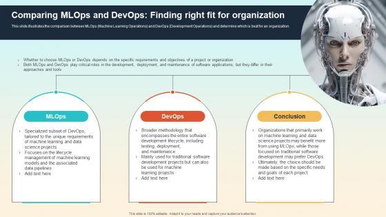 This slide illustrates the comparison between MLOps Machine Learning Operations and DevOps Development Operations and determine which is best for an organization. Are you in need of a template that can accommodate all of your creative concepts This one is crafted professionally and can be altered to fit any style. Use it with Google Slides or PowerPoint. Include striking photographs, symbols, depictions, and other visuals. Fill, move around, or remove text boxes as desired. Test out color palettes and font mixtures. Edit and save your work, or work with colleagues. Download Comparing MLOPs And Devops Finding Right Fit For Organization Introduction To MLOPs IT and observe how to make your presentation outstanding. Give an impeccable presentation to your group and make your presentation unforgettable. This slide illustrates the comparison between MLOps Machine Learning Operations and DevOps Development Operations and determine which is best for an organization.