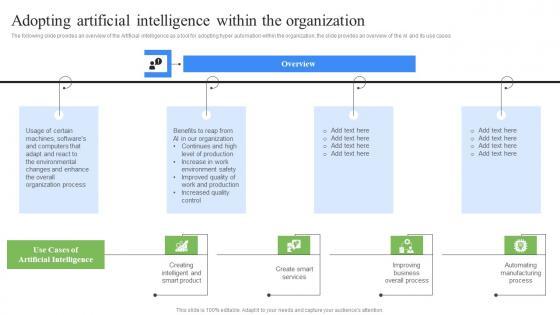 The following slide provides an overview of the Artificial intelligence as a tool for adopting hyper automation within the organization, the slide provides an overview of the AI and its use cases. Find a pre-designed and impeccable Adopting Artificial Intelligence Within The Organization RPA Influence On Industries Graphics Pdf. The templates can ace your presentation without additional effort. You can download these easy-to-edit presentation templates to make your presentation stand out from others. So, what are you waiting for Download the template from Slidegeeks today and give a unique touch to your presentation. The following slide provides an overview of the Artificial intelligence as a tool for adopting hyper automation within the organization, the slide provides an overview of the AI and its use cases.