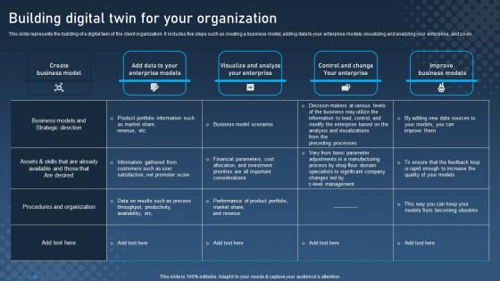 This slide represents the building of a digital twin of the client organization. It includes five steps such as creating a business model, adding data to your enterprise models, visualizing and analyzing your enterprise, and so on. Do you have to make sure that everyone on your team knows about any specific topic I yes, then you should give Building Digital Twin For Your Organization Digital Twins For Enhanced Industrial Information Pdf a try. Our experts have put a lot of knowledge and effort into creating this impeccable Building Digital Twin For Your Organization Digital Twins For Enhanced Industrial Information Pdf. You can use this template for your upcoming presentations, as the slides are perfect to represent even the tiniest detail. You can download these templates from the Slidegeeks website and these are easy to edit. So grab these today. This slide represents the building of a digital twin of the client organization. It includes five steps such as creating a business model, adding data to your enterprise models, visualizing and analyzing your enterprise, and so on.