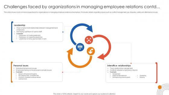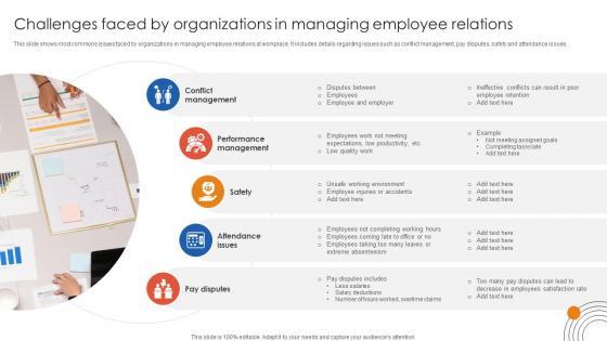 This slide shows most commons issues faced by organizations in managing employee relations at workplace. It includes details regarding issues such as conflict management, pay disputes, safety and attendance issues. Get a simple yet stunning designed Human Resource Industrial Relationship Challenges Faced By Organizations In Managing Employee. It is the best one to establish the tone in your meetings. It is an excellent way to make your presentations highly effective. So, download this PPT today from Slidegeeks and see the positive impacts. Our easy-to-edit Human Resource Industrial Relationship Challenges Faced By Organizations In Managing Employee can be your go-to option for all upcoming conferences and meetings. So, what are you waiting for Grab this template today. This slide shows most commons issues faced by organizations in managing employee relations at workplace. It includes details regarding issues such as conflict management, pay disputes, safety and attendance issues.