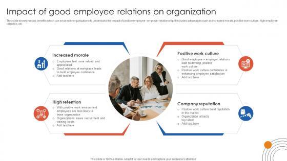 This slide shows various benefits which can be used by organizations to understand the impact of positive employee - employer relationship. It includes advantages such as increased morale, positive work culture, high employee retention, etc. Make sure to capture your audiences attention in your business displays with our gratis customizable Human Resource Industrial Relationship Impact Of Good Employee Relations On Organization. These are great for business strategies, office conferences, capital raising or task suggestions. If you desire to acquire more customers for your tech business and ensure they stay satisfied, create your own sales presentation with these plain slides. This slide shows various benefits which can be used by organizations to understand the impact of positive employee - employer relationship. It includes advantages such as increased morale, positive work culture, high employee retention, etc.