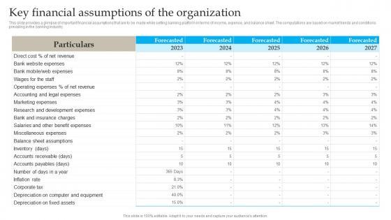 This slide provides a glimpse of important financial assumptions that are to be made while setting banking platform in terms of income, expense, and balance sheet. The computations are based on market trends and conditions prevailing in the banking industry. This Key Financial Assumptions Organization Banking Industry Business Plan Go To Market Strategy Structure Pdf is perfect for any presentation, be it in front of clients or colleagues. It is a versatile and stylish solution for organizing your meetings. The Key Financial Assumptions Organization Banking Industry Business Plan Go To Market Strategy Structure Pdf features a modern design for your presentation meetings. The adjustable and customizable slides provide unlimited possibilities for acing up your presentation. Slidegeeks has done all the homework before launching the product for you. So, do not wait, grab the presentation templates today This slide provides a glimpse of important financial assumptions that are to be made while setting banking platform in terms of income, expense, and balance sheet. The computations are based on market trends and conditions prevailing in the banking industry.