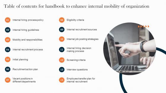 If you are looking for a format to display your unique thoughts, then the professionally designed Table Of Contents For Handbook To Enhance Internal Mobility Of Organization Pictures Pdf is the one for you. You can use it as a Google Slides template or a PowerPoint template. Incorporate impressive visuals, symbols, images, and other charts. Modify or reorganize the text boxes as you desire. Experiment with shade schemes and font pairings. Alter, share or cooperate with other people on your work. Download Table Of Contents For Handbook To Enhance Internal Mobility Of Organization Pictures Pdf and find out how to give a successful presentation. Present a perfect display to your team and make your presentation unforgettable. Our Table Of Contents For Handbook To Enhance Internal Mobility Of Organization Pictures Pdf are topically designed to provide an attractive backdrop to any subject. Use them to look like a presentation pro.