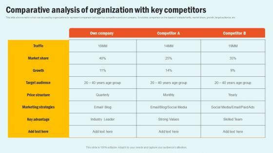 This slide shows matrix which can be used by organizations to represent comparison between top competitors and own company. It includes comparison on the basis of website traffic, market share, growth, target audience, etc. Slidegeeks is here to make your presentations a breeze with Comparative Analysis Organization Enhancing Website Performance With Search Engine Content Themes Pdf With our easy to use and customizable templates, you can focus on delivering your ideas rather than worrying about formatting. With a variety of designs to choose from, you are sure to find one that suits your needs. And with animations and unique photos, illustrations, and fonts, you can make your presentation pop. So whether you are giving a sales pitch or presenting to the board, make sure to check out Slidegeeks first This slide shows matrix which can be used by organizations to represent comparison between top competitors and own company. It includes comparison on the basis of website traffic, market share, growth, target audience, etc.